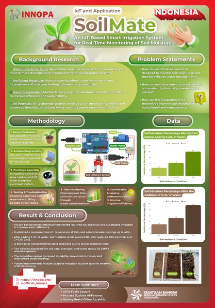 SoilMate is an innovative IoT-based smart irrigation prototype designed to optimize agricultural water management through automation and real-time monitoring. The system integrates essential yet powerful components—an Arduino Uno microcontroller, YL-69 soil moisture sensors, a relay module, and a DC water pump—forming a compact model that automatically regulates water supply based on real-time soil conditions. Built as a sustainable, low-cost, and educational project