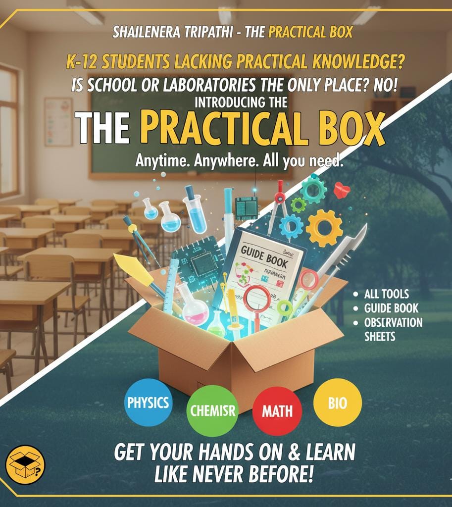K-12 students lacking practical knowledge? Is school or laboratories the only place to learn practical knowledge? No! Introducing THE PRACTICAL BOX. Anytime, anywhere, the box is all you need. Physics, chemistry, math or bio, practical knowledge is on the go. Equipped with all the tools, guide book and observation sheets, get your hands on and learn like never before.