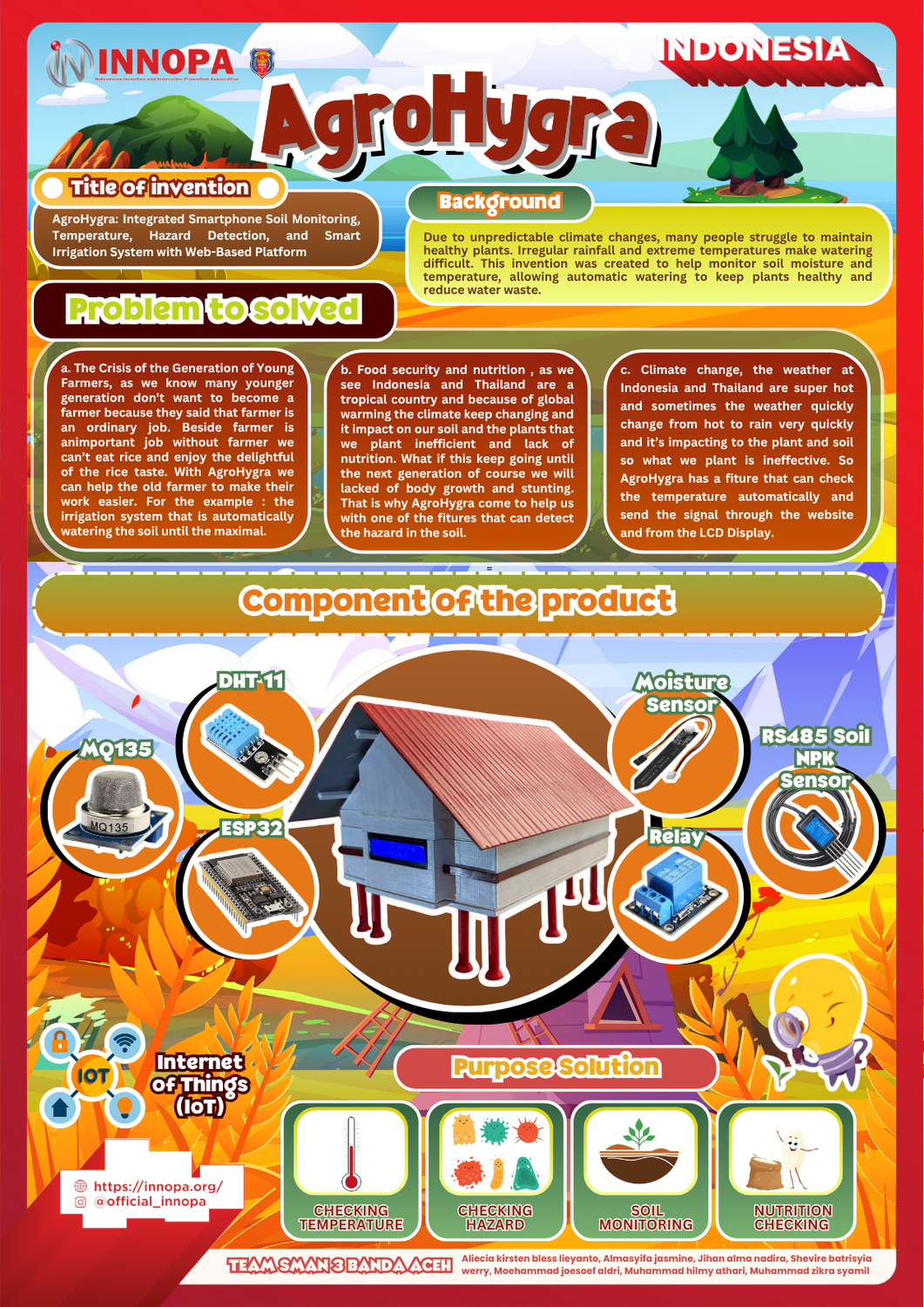 "The invention that we designed is an innovation that we developed for modern agriculture, AgroHygra is the name of this innovation which means. Agro in the agricultural sector that includes all aspects of food production. While Hygra is a word taken from the Greek language (hygros) which means humidity/moisteness. This tool has several main components, namely: 1. Temperature sensor- to measure temperature to keep the temperature stable 2. LCD Display- to show data results 3. Soil moisture.