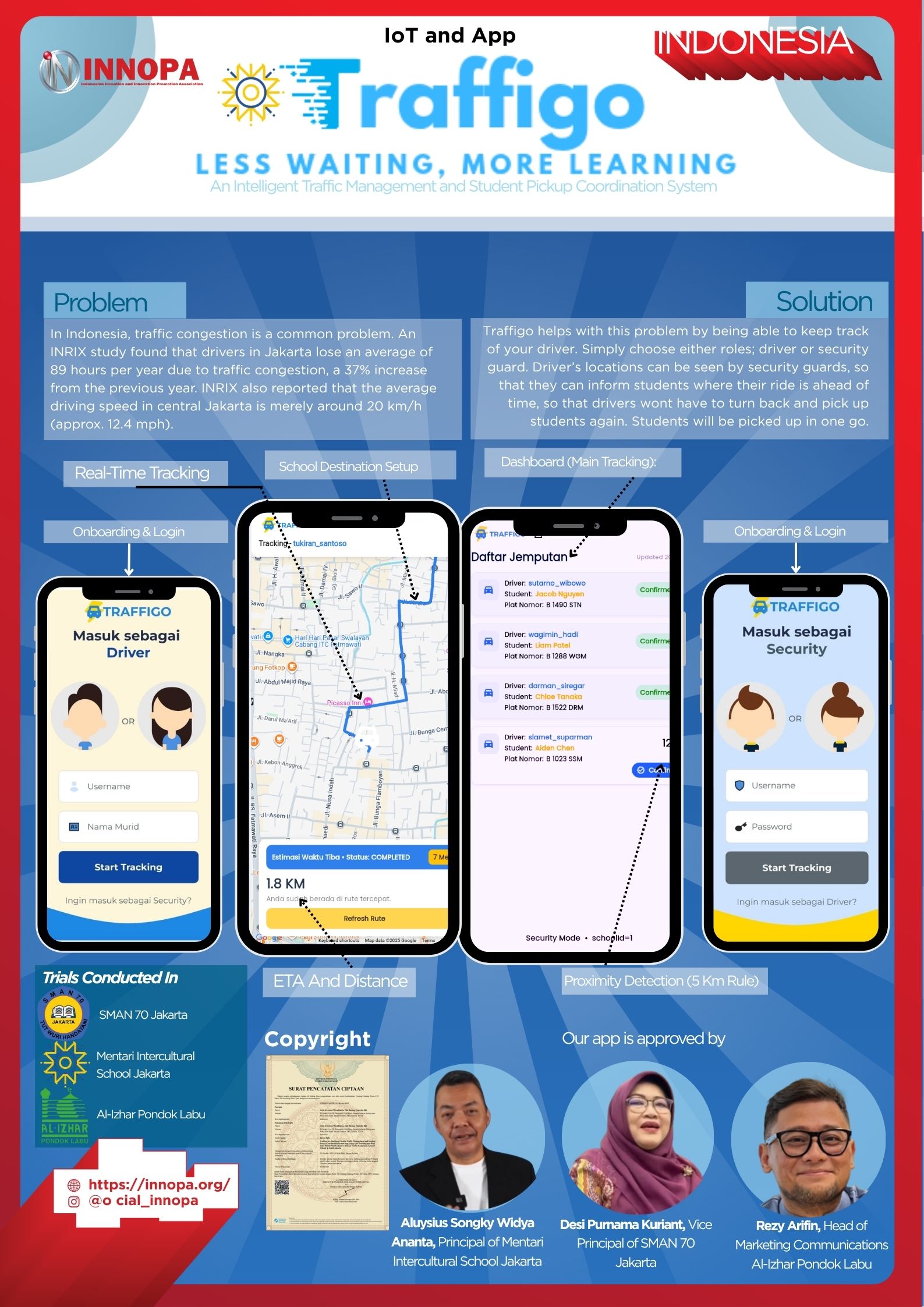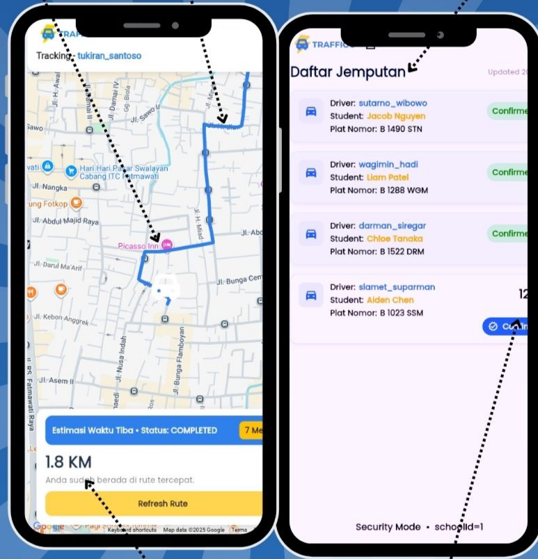 Traffic congestion around schools in South Jakarta has become a recurring issue, primarily caused by the high number of private vehicles used for student pickup. To address this, the Traffigo mobile application was developed as an intelligent traffic management and student pickup coordination system that utilizes GPS tracking, geofencing, and real-time notifications. Through trials conducted at three schools, Mentari Intercultural School Jakarta, Al-Izhar Pondok Labu, and SMA Negeri 70.