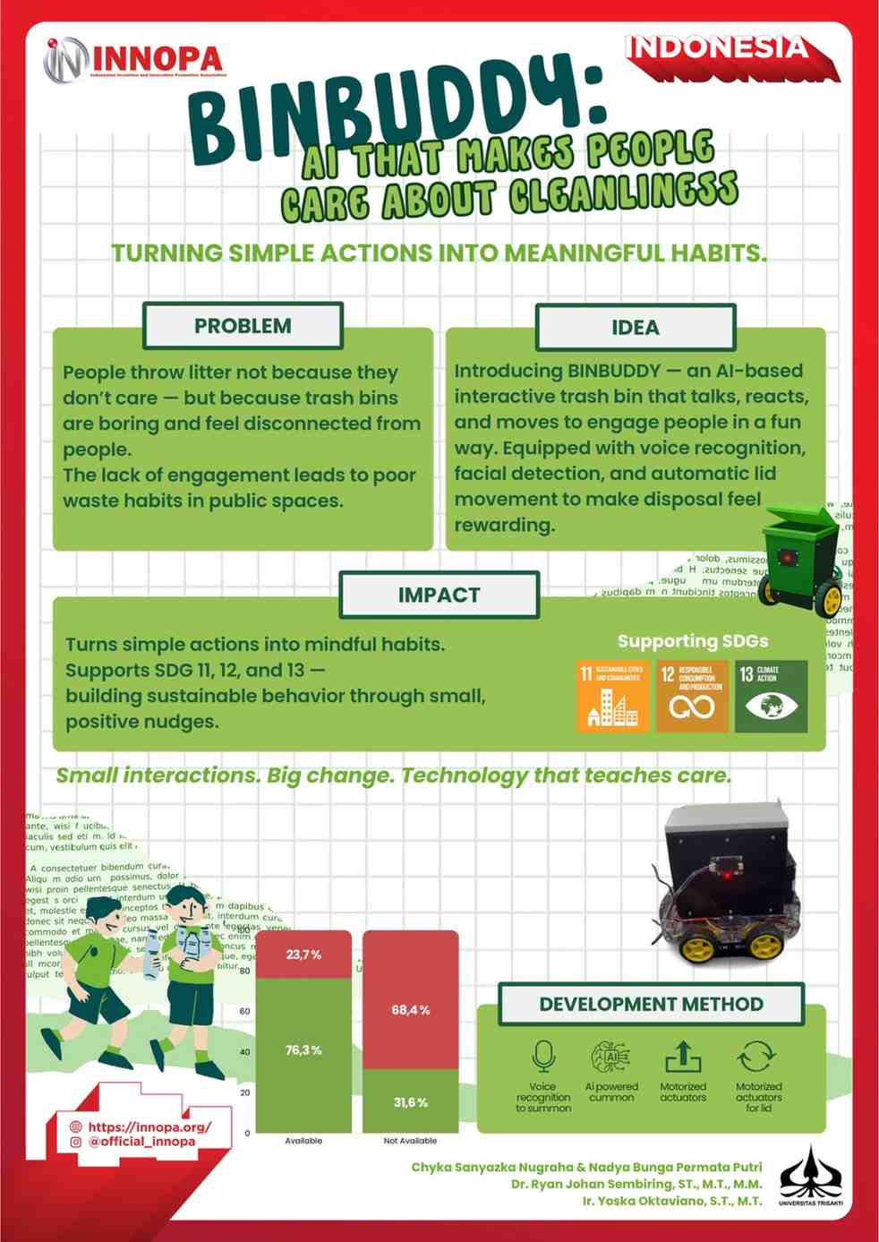 BinBuddy is an AI-based interactive trash bin designed to improve proper waste disposal behavior. Equipped with voice and facial recognition, it automatically opens and closes its lid while responding interactively to users. This innovation not only facilitates hygienic waste disposal but also promotes environmental awareness and supports the SDGs through sustainable and engaging technology.