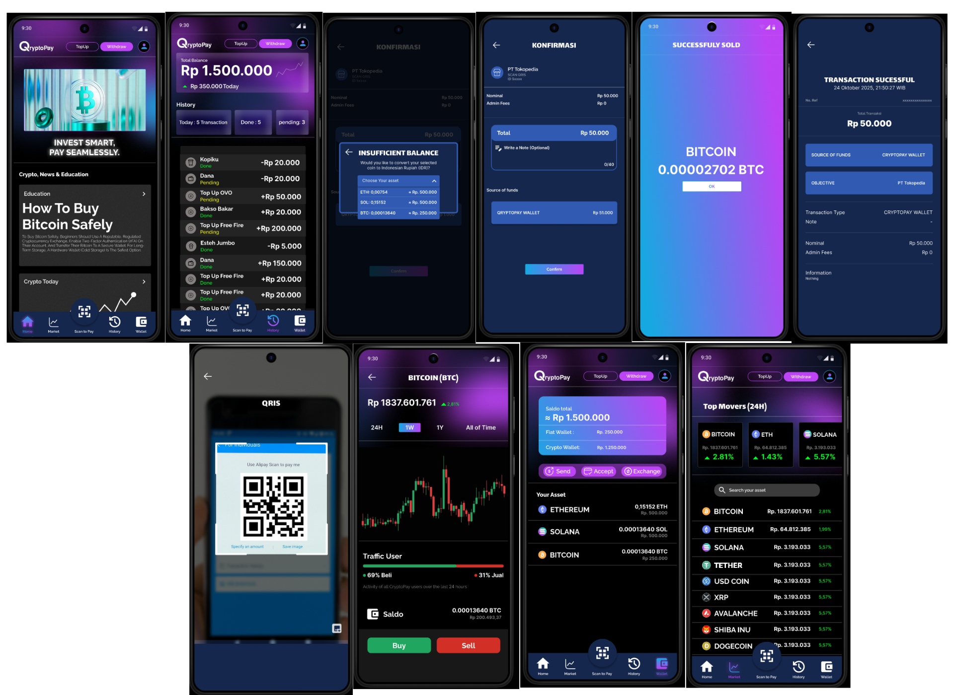 Qryptopay bridges crypto investment and QRIS payments. It solves the inability to spend crypto value, caused by Indonesia's crypto payment ban & slow manual conversions. Its "Dual Wallet" (IDR + Crypto) and "Real-Time Auto-Convert" mechanism enable seamless payments. When IDR balance is low during a QRIS scan, the app auto-sells crypto to fund the IDR wallet, completing the payment in Rupiah. This makes crypto a liquid, spendable asset while compliant with Bappebti & Bank Indonesia.