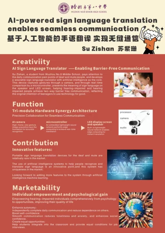 This product is an AI-powered wearable sign language translator designed to facilitate barrier-free communication for the hearing-impaired. Equipped with a high-precision camera to capture hand gestures, it utilizes AI algorithms for real-time sign language recognition and translation. The translated content is output via voice broadcast and LED screen display, enabling seamless two-way communication between deaf/hard-of-hearing individuals and hearing individuals.