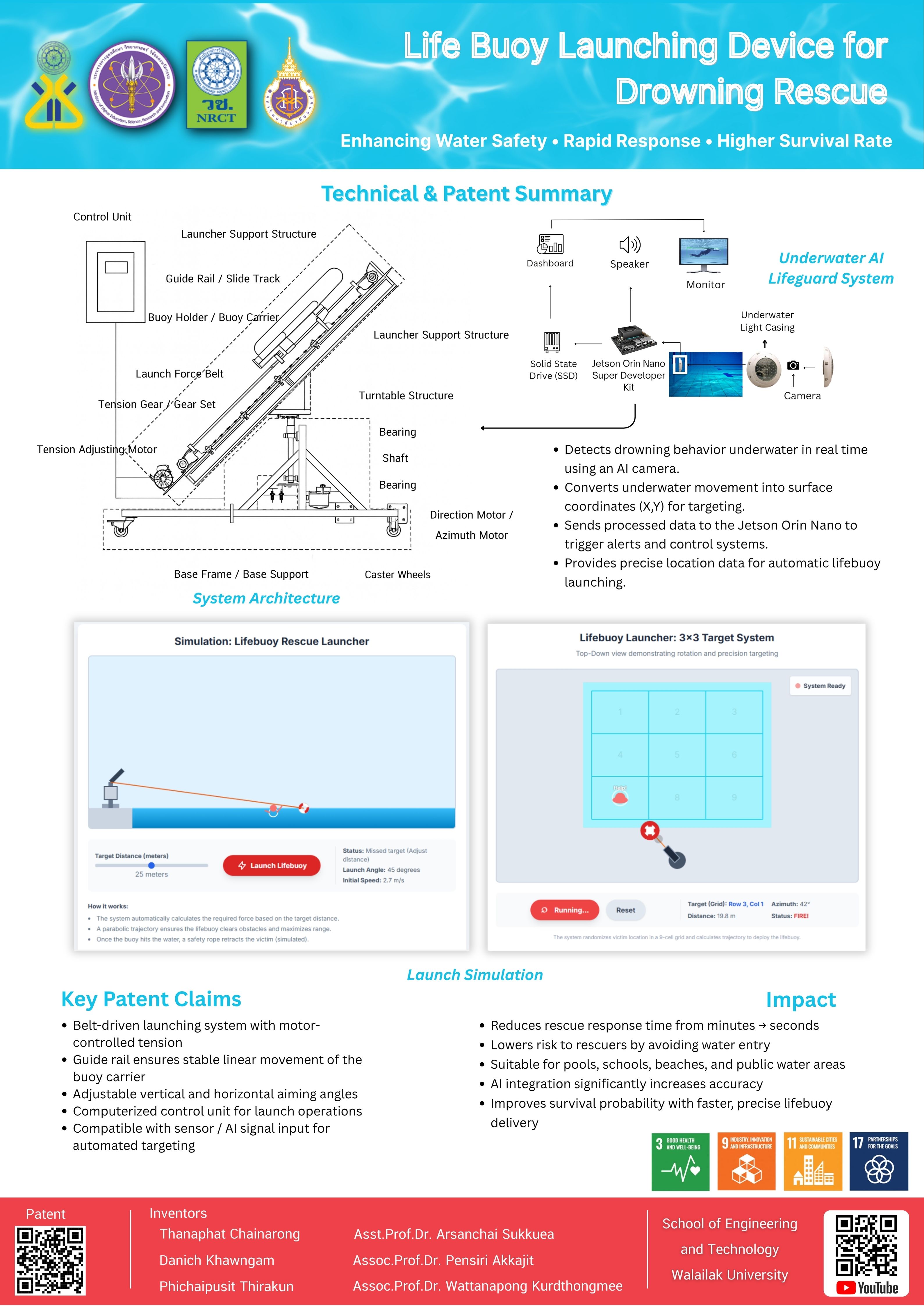 A smart life buoy launching device designed to improve drowning rescue efficiency. The system uses sensors to detect a person entering the water and calculates distance and direction to automatically launch a buoy with high accuracy. Equipped with robotics, microcontrollers, and IoT connectivity, it provides instant alerts to rescue teams, enables remote activation, reduces response time, and enhances safety in pools, rivers, ports, and coastal areas.