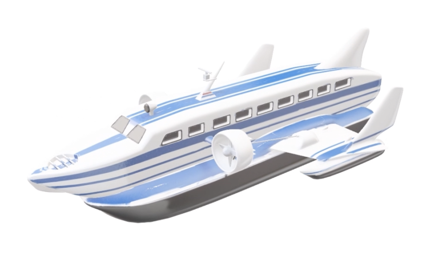 A hovercraft with aerodynamic unloading combines the principles of aerostatics and hydrodynamics. It is designed to move above water, ice, soil and other surfaces with minimal load on the supporting surface due to the creation of an air layer under the bottom of the ship and reducing the resistance to movement due to the effect of aerodynamic unloading.