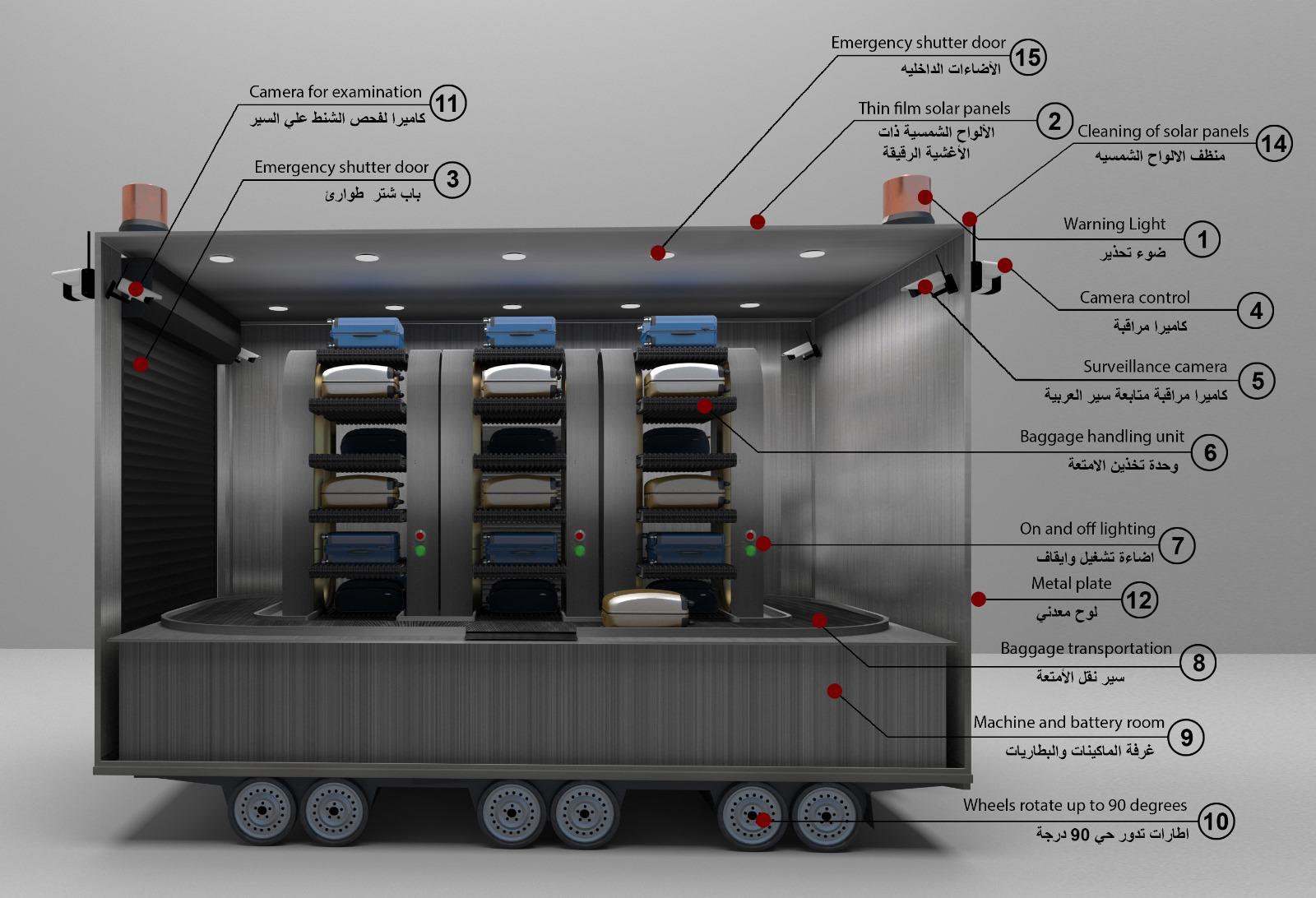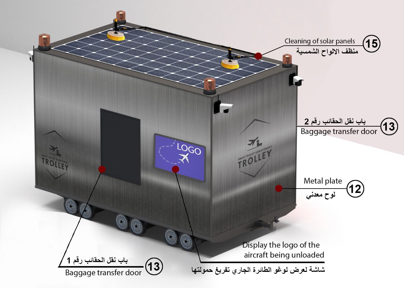 Think of a smart Arab project. It is a cart that helps protect aircraft from the dangers of explosive materials or all kinds of prohibited items, and eliminates the need for workers. It also protects bags from breaking items. The project is when the traveler goes to the airport and goes to the airport counter to complete travel procedures and enter the bag into the bag conveyor and enter through the airport counter to the bag conveyor without using workers to smart shopping. The bags move from t
