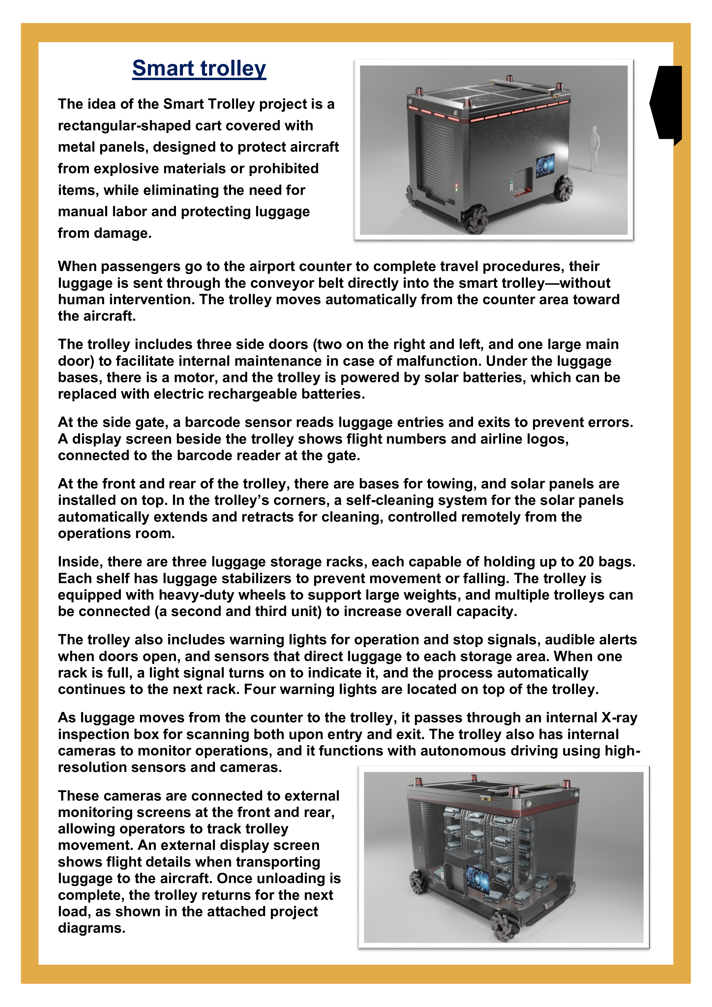 The Smart Trolley is a luggage transport unit with a rectangular design, covered with reinforced metal panels. It is designed to protect aircraft from prohibited or explosive materials, eliminate the need for manual labor in handling luggage, and prevent baggage from being damaged during transport. When a passenger approaches the airport counter to complete check-in procedures, their luggage is transferred through the conveyor belt directly into the Smart Trolley without any human